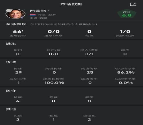 雷速体育11月2日宣 在今天凌晨进行的热刺主场vs切尔西的英超比赛中,哈维·西蒙斯第7分钟替换上场表现平淡,在第73分钟被换下。